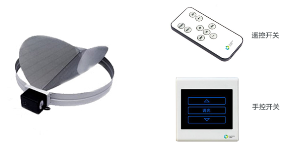 无电照明系统可以根据用户的需求,通过墙壁上的手控开关或者小型遥控器,控制小型电机带动遮光片进行旋转,对室内光照度进行调节甚至完全关闭。